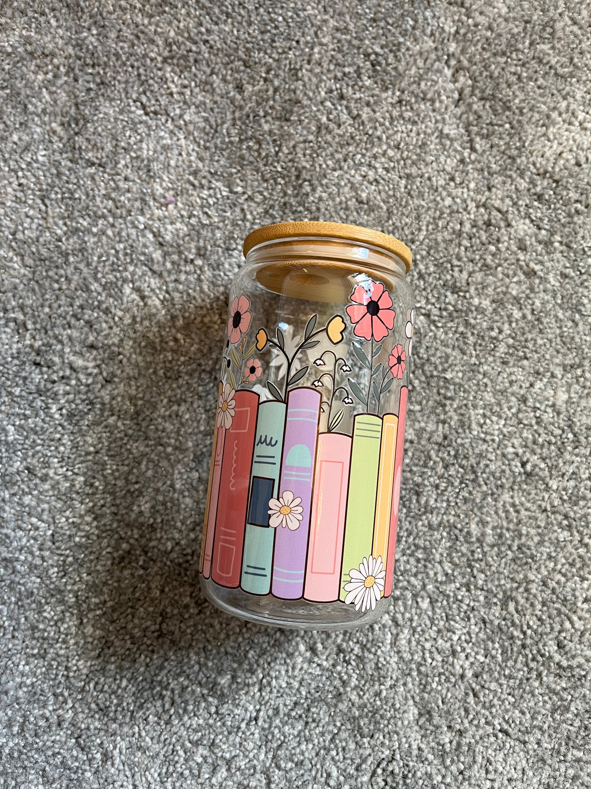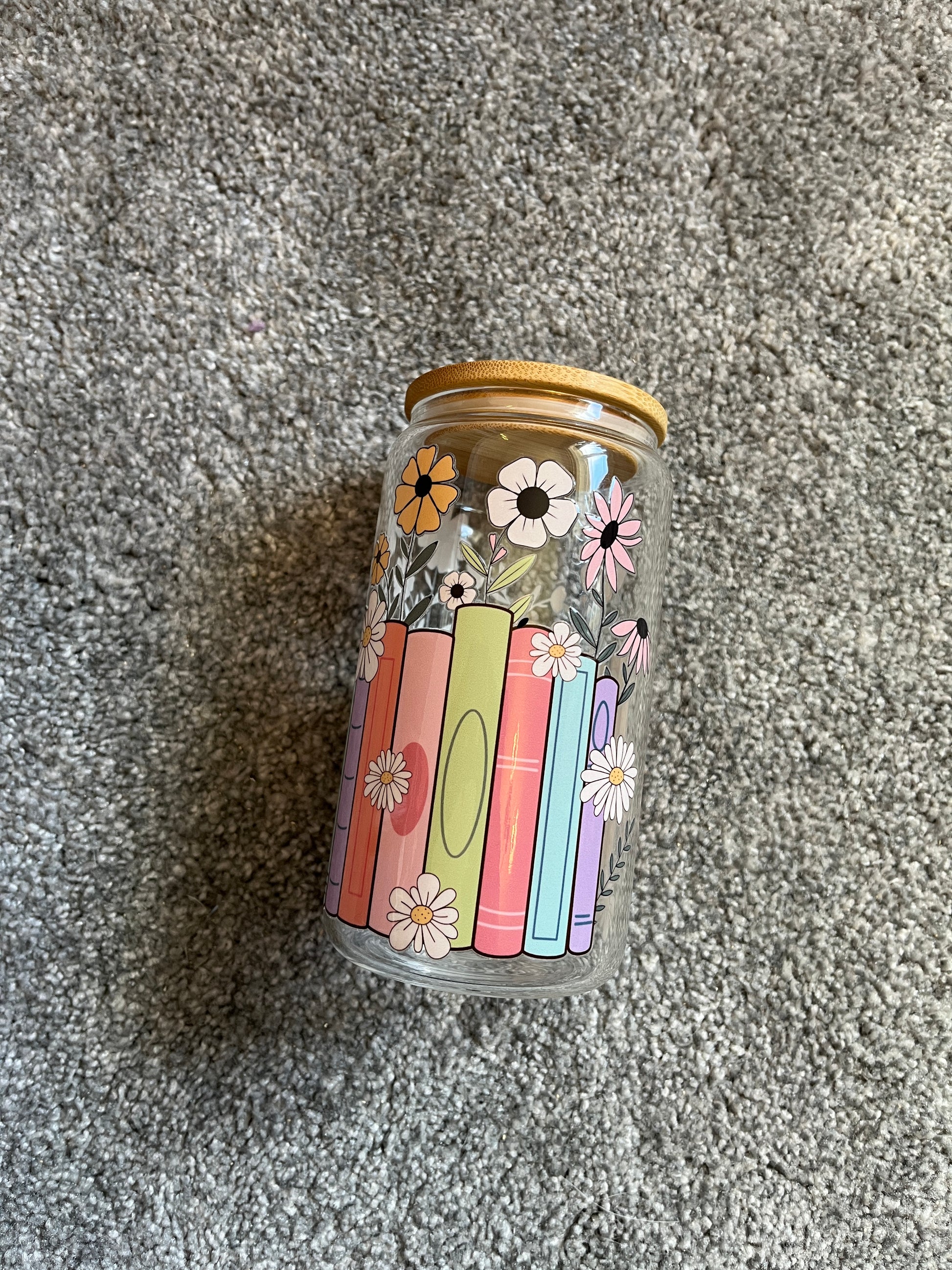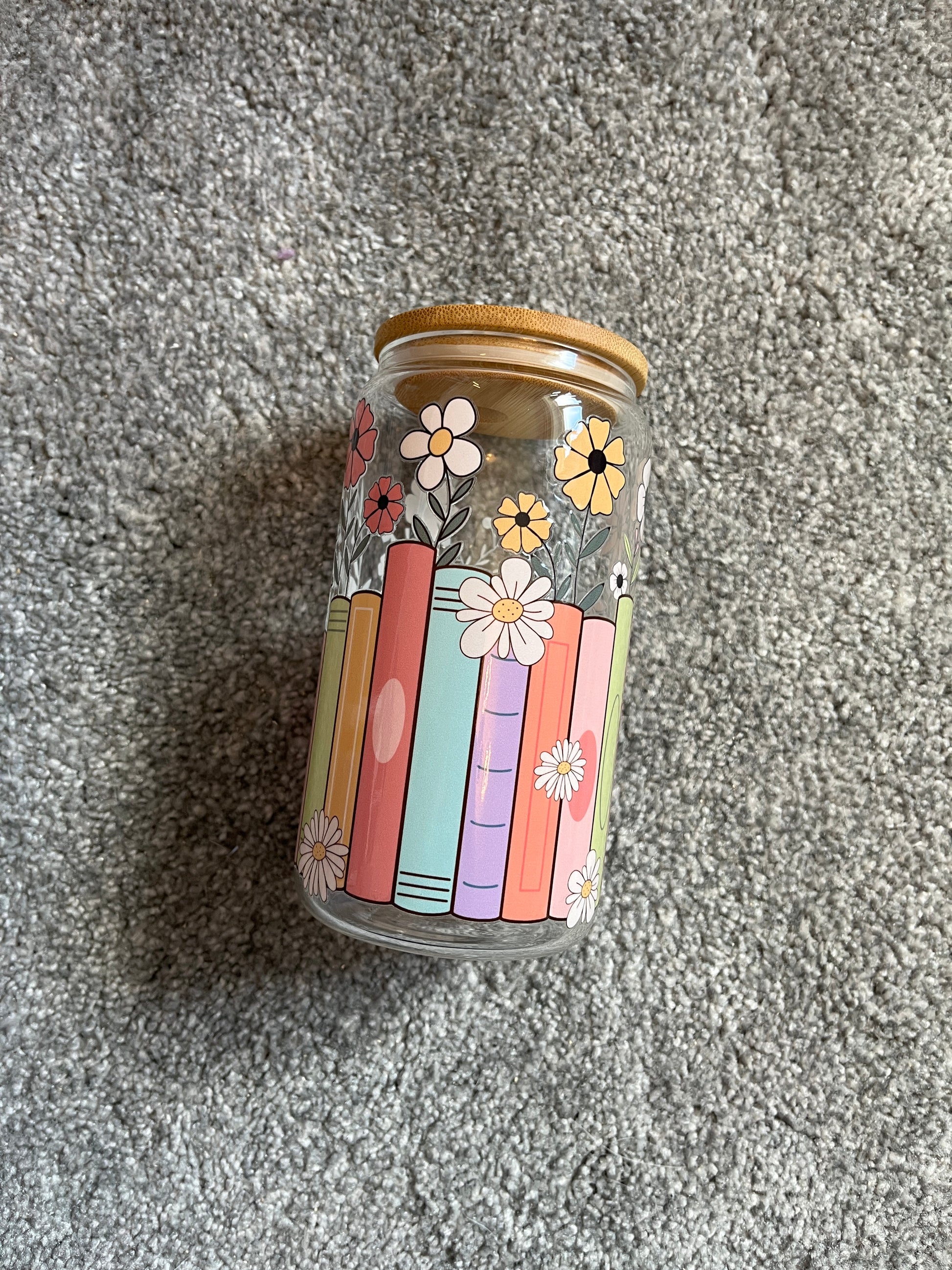 Book lovers can combine their love of a book shelf and pretty flowers with this super cute glass can.