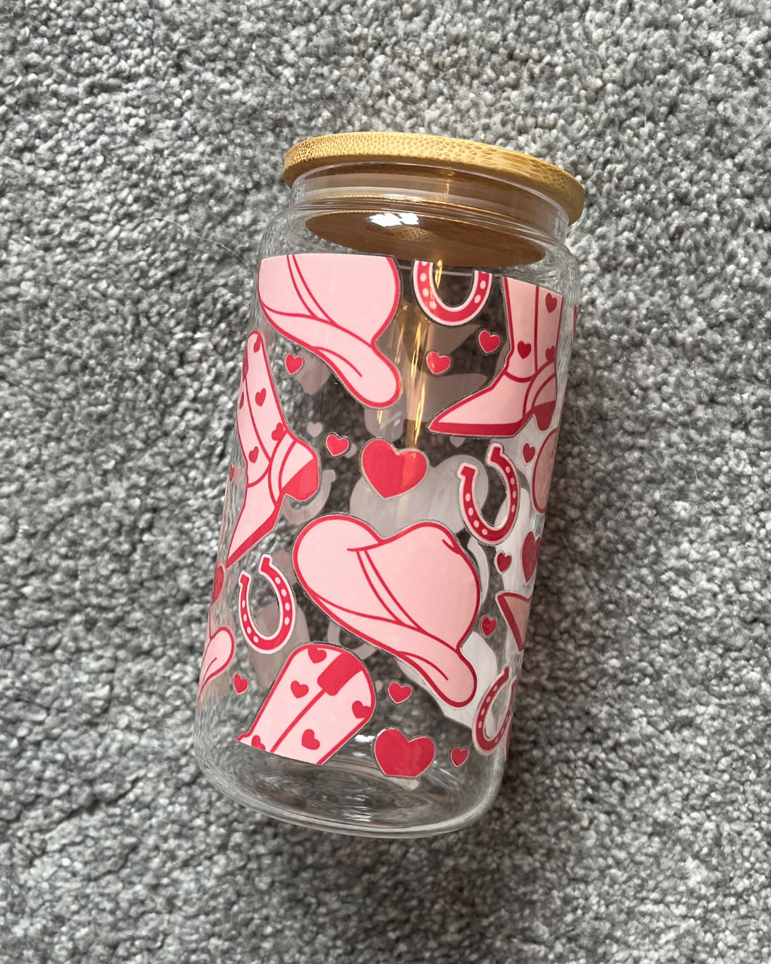 Covered in pink and red cowboy hats and hearts, the glass can holds 16oz of fluid and the design is made with high-grade UV-DTF so is more hardwearing than normal vinyl. It also comes with a bamboo lid and plastic straw.