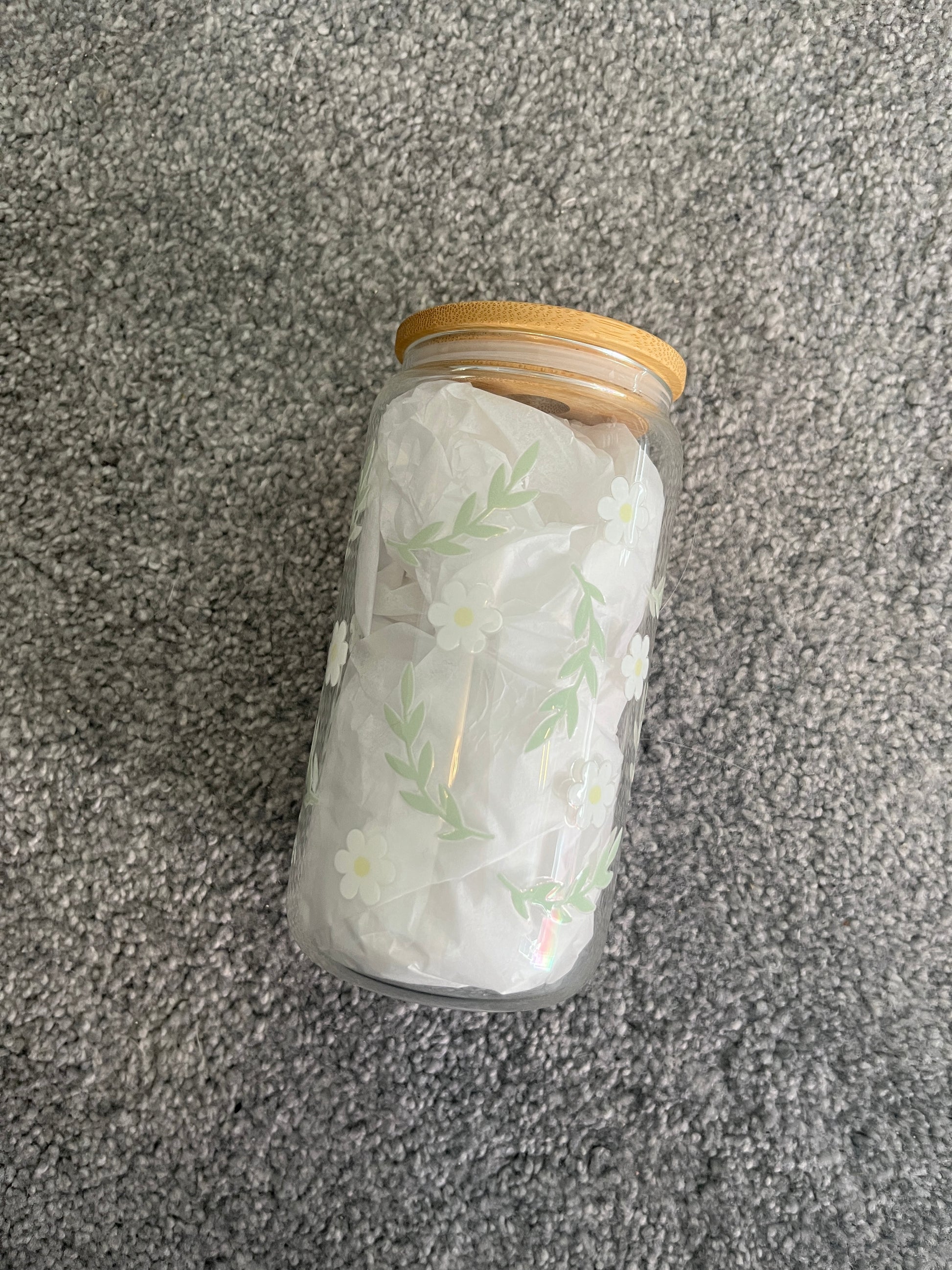 As with all of the glass cans, this comes with a bamboo lid and plastic straw so it's almost impossible to spill.
